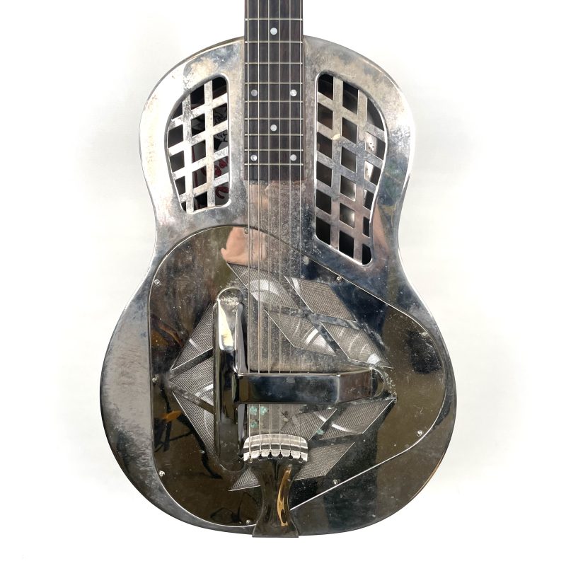 From an estate we have a 1990s Regal RC-51 Tricone Resonator in Nickel Plated Brass, good condition, but certainly has a very worn, authentic patina, but no abuse. This guitar has a bit of a story. It is a roundneck, but is currently set up as a square neck would be, set high for lap…