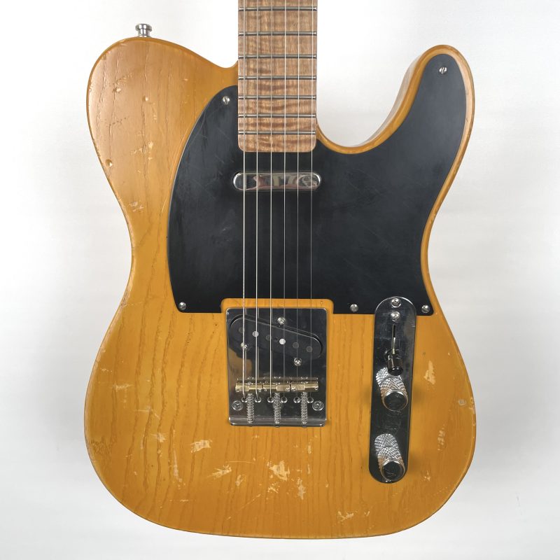 For sale we have a Fender-styled 51 Tele Hot Rod Parts Guitar in Butterscotch in overall very good condition. To be clear, this guitar is custom built and is not a Fender product. We do not know who built the guitar, but it is a nice, solid build. Quality unknown maker ash body with butterscotch…