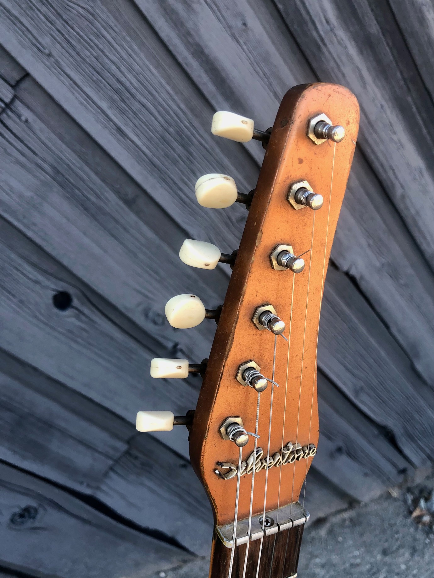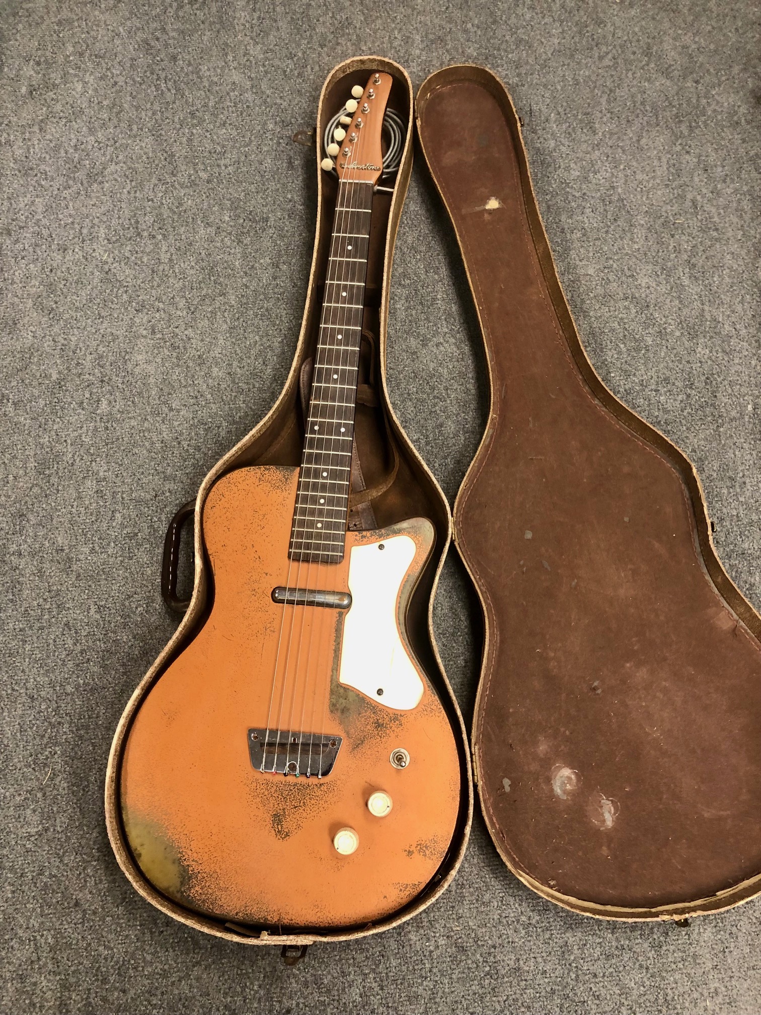 On consignment (sorry no trades) is a 1959 Silvertone U-1 Electric Guitar w/original case, in copper finish in good condition. Silvertone was rebranded Danelctros for the Sears catalog. Made in Chicago. Minus the lower strap button and a replaced input jack, 100% original. Lots of honest finish wear and relicing, but clean frets and a great neck. That classic lipstick pickup sound. Brazilian rosewood fingerboard in great shape. Everybody should have one of these. This guitar is cooler than cucumbers. Must have affordable vintage awesomeness. Local sales only.