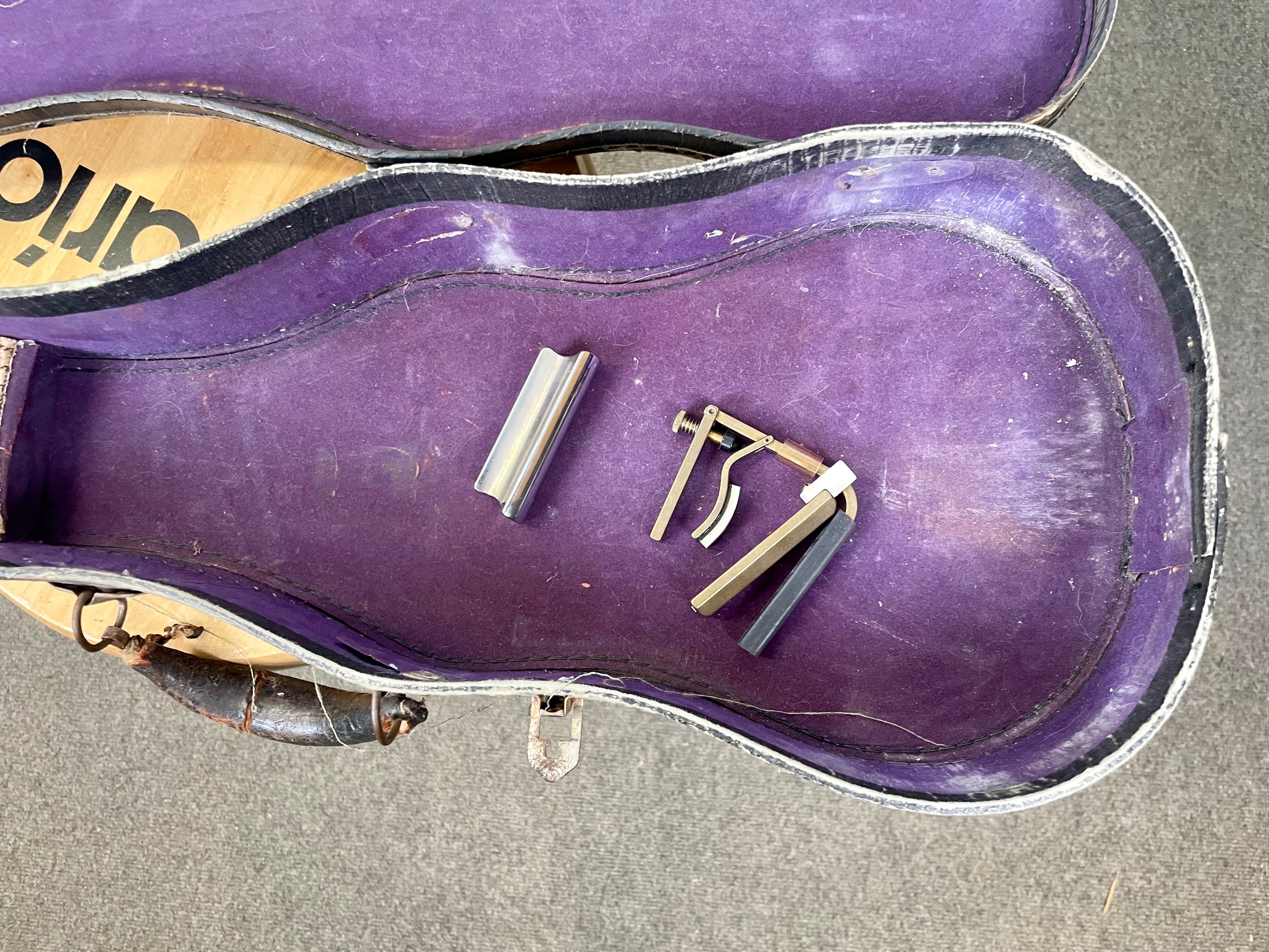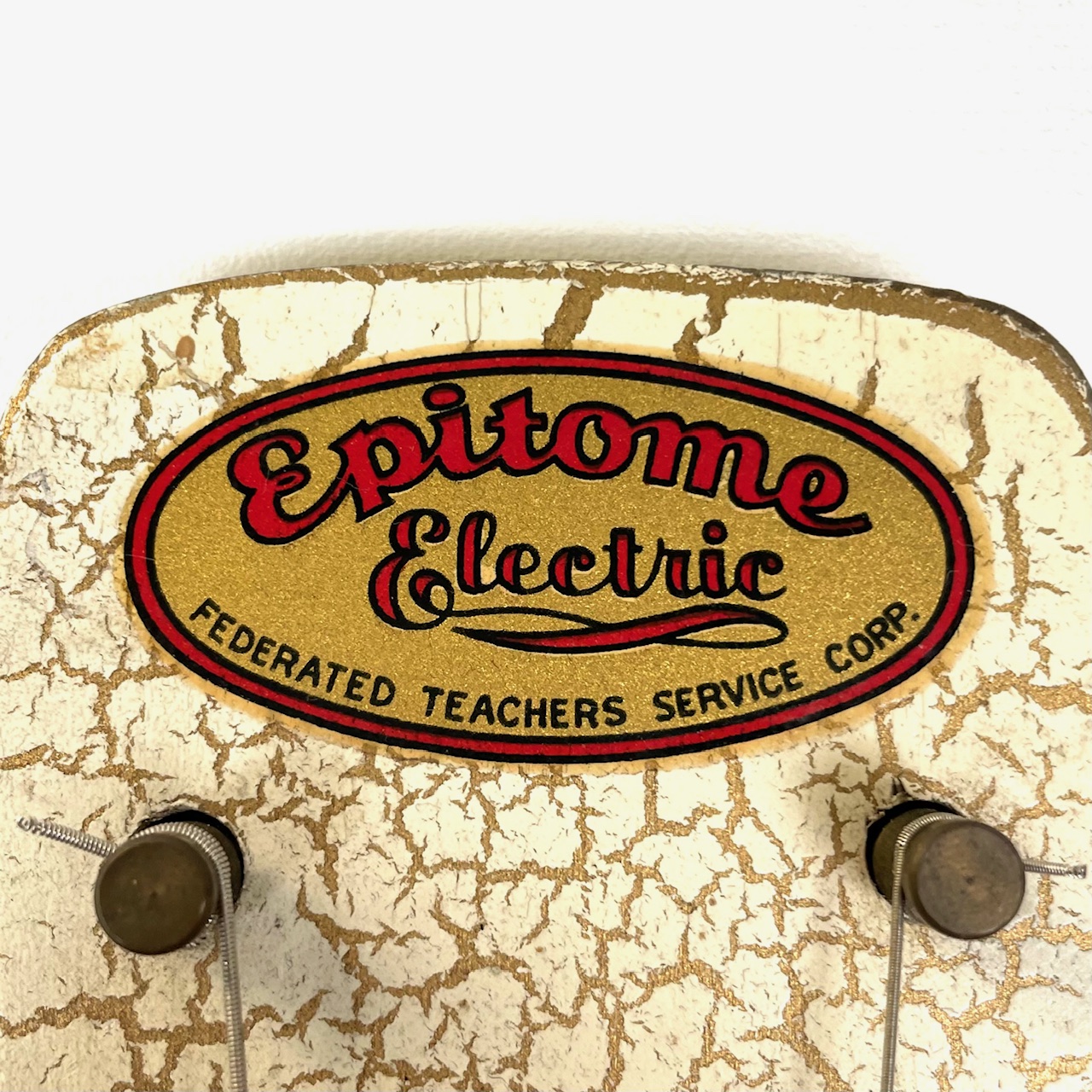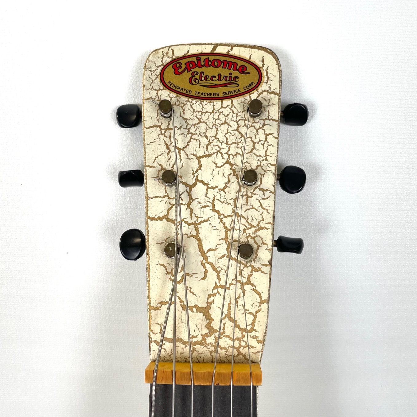 For sale we have a ca. 1950 Epitome Lap Steel w/vintage case and accessories in very good condition. Upgraded tuners, otherwise stock all the way. This ‘Epitome Electric’ lap steel guitar shows the name ‘Federated Teachers Service Corp.’ on its headstock. This instrument was built by the Jackson Guldan Co., Columbus, Ohio, who traded from 1915 to 1971. This one is late 40’s to early 50’s. That company is more famous for its violins. The single pickup is a plain chrome Hershey Bar type, riveted to a metal plate. Ready to go, really fun and good sounding steel with a great vibe. Call us for an appointment- 828.253.2003