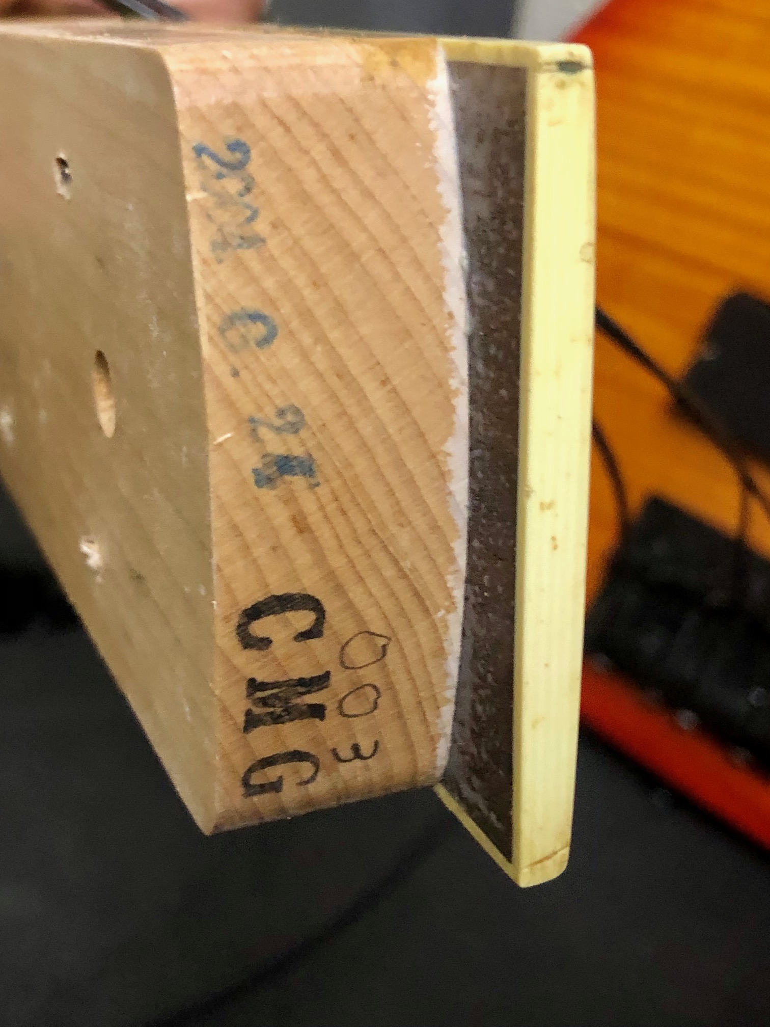 For sale we have a used 2004 (see neck stamp photo) Jackson CMG 4-string Concert Bass in a stunning amber sunburst (ASB per neck pocket photo) w Gator hardshell case in solid good, nearing very good condition. 7 digit serial number, Made in Japan. This guitar features stock EMG electronics, and is currently set up with 110-55 tape wound strings, not sure who made these strings, with a string action of .1″ at the 12th fret. This bass weighs 9# and is per the web an alder body, plays comfortably and well. Maple neck (34″ scale length, 1.5″ nut, rosewood fingerboard, flame maple top, active emg electronics and I think represents a great value with a Japan.